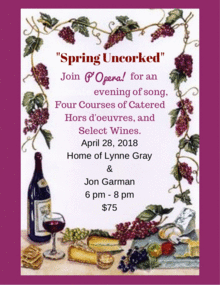 Plan now to join us for an intimate evening of song by select P'Opera! Soloists, Four Courses of Catered Hors d'oeuvres, and a selection of wines.