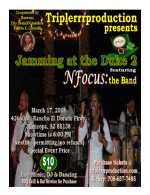 The band NFocus will be performing a variety of Old & New School music on the patio of the Duke Country Club. You have the option to see & here the show on the patio or inside the country club. The Country Club will be selling BBQ grill food & serving alcohol beverages on the patio. Come out on St. Patrick's Day night and enjoy the music and food with NFocus. Ticket price is only $10. Buy tickets @ www.triplerrrproduction.com or call Rickey 708-657-7485