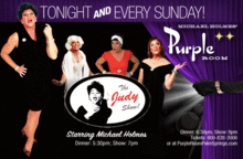 The spirit of Judy Garland is alive and well and in Palm Springs at the famed Purple Room Restaurant & Stage every Sunday at 7:00! This blend of hysterical comedy and outstanding music explode into an evening of nonstop belly laughs, glamour and high camp, as celebrated entertainer Michael Holmes parodies Judy Garland, who in her 1964 television variety show, played host to some of the greatest female icons of the Golden Age of Hollywood. With a killer wardrobe and razor-sharp wit, Holmes plays and nails them all, singing your favorite songs and thrilling the audience with charm, zingers and stories.