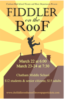 On March 22 - 24, the Chatham High School (CHS) Theatre Department will present the renowned musical Fiddler on the Roof by Joseph Stein. Performances will be held Thursday, March 22 at 6:00 p.m. and March 23 & 24 at 7:30 p.m. Due to construction at CHS, performances will be held at Chatham Middle School (CMS).