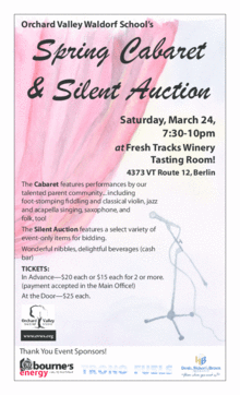 The Cabaret will feature performances by our talented parent community...including fiddling and classical violin, jazz and acapella singing, saxophone, and folk, too! The Silent Auction features a select variety of event-only items for bidding. Wonderful nibbles, delightful beverages (cash bar).