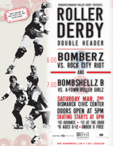 Starting at 6:00 PM, the BisMan Bomberz team skate against Rock City Riot, kicking off an evening of excitement and all male action. Don't be fooled by their good looks, the BisMan Bomberz are ready to skate fast, hit hard, and bruise up the competition. Immediately following the first bout, the BisMan Bombshellz B team will be sporting their sassy skills in bout fashion when they take on the A-Town Roller Girlz. The BisMan Bombshellz B team may seem sweet, but they're ready to slam, knock, and hit their way to a win! Approximate start time is 7:00pm. Tickets are available now at www.brownpapertickets.com or from your favorite derby skater. Other outlets include Reza's Pitch, Rhythm Records, Hot Topic and at the door the day of the event. Pre-sale ticket price is $10, $12 at the door. Children 12 and under are $8 and 5 and under are free. Please, no strollers, coolers or beverage containers; concessions will be available inside. This bout's charity is Care Mobile. The Ronald McDonald Care Mobile is a state of the art mobile dental clinic that provides desperately needed oral health care directly to underserved children in their own neighborhoods in western North Dakota. They serve children between the ages of 0 through 21 who do not have a regular dentist or who have not seen a dentist in the past two years. Come out and support your local roller derby, with action packed entertainment and family fun. For more information and to meet the BisMan Bombshellz League, check out www.bismanbombshellz.com.