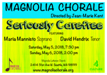 Though the weather may still be frosty, the Magnolia Chorale is warming up for our blockbuster spring concert series and we invite you to join us. Seriously Carefree is the theme and it covers a repertoire packed with fun and romance, poetry and opera, and just a bit of the unexpected. Featuring soloists Maria Mannisto and David Hendrix.