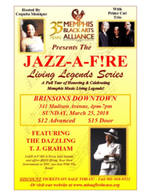 The Memphis Black Arts Alliance has been delighted to present some of the BEST artist in the Greater Memphis area and beyond at Jazz-A-F!RE, held Every Last Sunday of the month from 4-7pm at the Beautiful Brinson's Restaurant & Lounge, located at 341 Madison Avenue, Downtown Memphis. This month, March 25th, we continue our year-long 35th Anniversary Celebration as we honor the outstanding accomplishments of the Legendary Jazz Vocalist, T.J. Graham!