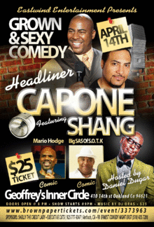 Headlining Capone, Bay Area Eastwind Entertainment invites you for an evening of side splitting laughter. You've seen him on major TV shows including Shaq's all star comedy, Def Jam and Comic View, Showtime at the Apollo! Showcasing his acting skills in the movies Paper Soldiers co-starring Kevin Hart & Death of a Dynasty...all the way from New York City, help me welcome to our stage the gangster of comedy CAPONE!!!