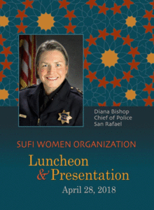 Sufi Women Organization (SWO) presents Women's Wisdom: Women in Action, a Luncheon and Presentation featuring Diana Bishop, Chief of Police, San Rafael Police Department, who will talk about her 30-plus years in law enforcement and how things have evolved for women in a male dominated profession. Chief Diana Bishop was appointed as San Rafael's sixteenth police chief on January 9, 2012. She grew up in Los Altos and began her law enforcement career in 1985 when she joined the Santa Clara Police Department as a patrol officer. Chief Bishop rose through the ranks, promoting to Captain in 2006, and served in a wide variety of assignments during her 26 years with Santa Clara.