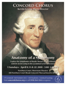 Join Kevin Leong, Music Director of the Concord Chorus, on a guided listening tour of the classical symphony. This three-lecture series will explore prominent symphonies of Beethoven, Mozart, and Haydn to gain insight into their formal structure, including how composers chose to adhere to or break formal rules and how they employed these forms in their choral works.