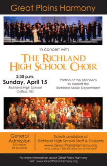 Enjoy an afternoon of Hee Haw and Gospel when Great Plains Harmony, and it's quartets, come to Richland High School. Featuring Special Guests Richland High School Choir. Enjoy great music and give back to the school as part of the proceeds will go to the Richland High School Music department!