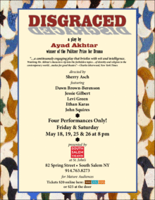 All "Disgraced" attendees will receive a complimentary glass of wine with a dinner entree before the show with ticket confirmation or after the show with a "Disgraced" program at the Horse and Hound Restaurant on 94 Spring Street, South Salem, NY 10590.
