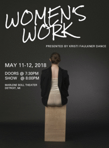 "Women's Work" features 2 days of performances by over 2 dozen independent artists and is part of an initiative developed by Kristi Faulkner Dance to spur creative ideas and support the work of other artists.