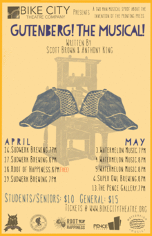 Come one, come all to the theatrical, beertastical event of a lifetime! Coming soon to a brewery near you, Gutenberg! The Musical! presented by Bike City Theatre Company brings big laughs to the small stage.