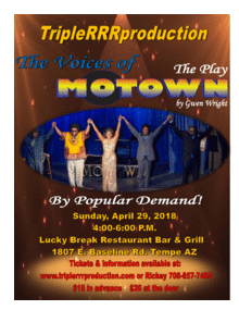 TripleRRRproduction The Voices Of Motown Play. Play writer Gwen Wright is directing this play about The relationship of Barry Gordy with the mega stars Marvin Gaye, David Ruffin, Stevie Wonder & Diana Ross. The play is at the Lucky Break Restaurant & Bar. The cast will sing songs, dance and entertainment you into the era & life of the making of the Motown Dynasty. The cast consist of Tracy Sanders, Eric Harris, Cree Turner, Robert Hudson. Come out and enjoy a evening of good food & drinks & sit back and experience this trip back into Motown.