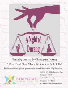 Join Striplight Community Theatre as we present two parodies of classic theatre pieces by Christopher Durang. The first show is titled Medea taken from the ancient Greek tragedy of the same name by Euripides. The second show of the evening, For Whom the Southern Belle Tolls, is based on Tennessee Williams The Glass Menagerie.