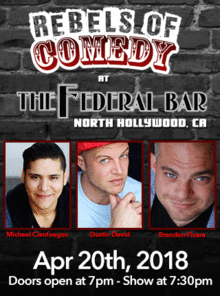 It's Rebels of Comedy at the Federal Bar in North Hollywood. Come out and see a night of live comedy, featuring an awesome lineup of professional features and headliner comedians.