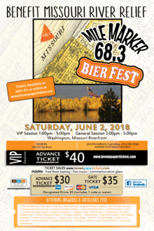 Mile Marker 68.3 Bier Fest is a fund raising event to benefit the Missouri River Relief. The Bier Fest will be held at John G's Bier Deck overlooking the Missouri River on Saturday 2 June 2018 in Washington, Mo. The events bring people's love for the river and enjoyment of great biers and spirits together. Missouri River Relief is a non for profit origination dedicated to the clean up and education about the importance of clean waterways. Cheers