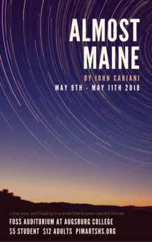 Almost, Maine is comprised of nine fantastical vignettes portraying events that are occurring simultaneously on the night that the Northern Lights are visible. It deals with themes of love, loss, and healing in a small Maine town named Almost. The characters experience the happiness, heartbreak, and bittersweet moments of love.