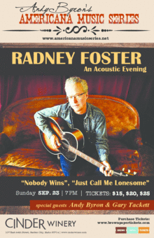 RADNEY FOSTER LIVE AT CINDER WINES FEATURING HITS SUCH AS "NOBODY WINS" AND "JUST CALL ME LONESOME" With Andy Byron and Gary Tackett opening.