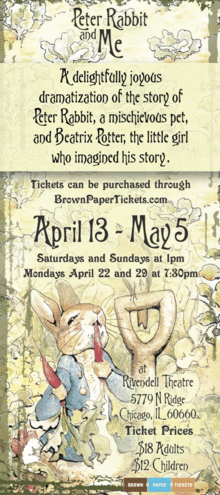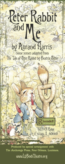 Li'l Buds presents Peter Rabbit and Me by Aurand Harris. A delightfully joyous dramatization of the story of Peter Rabbit, a mischievous pet, and Beatrix Potter, the little girl who imagined his story.