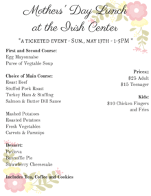 Join us for a 4 course lunch/dinner on Mother's Day, running from 1-5! John "Lefty" Kelly will be on hand that afternoon to serenade all of the wonderful mothers. Make sure to pamper mom the right way, by bringing her to the Irish Center for a fun afternoon filled with food and music!