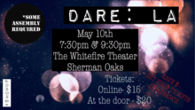 After our last DARE LA, these eight creators were randomly assigned an audience-written DARE to inspire their work. They were given 1 MONTH to write and 1 MONTH to rehearse/shoot. We will be presenting their finished pieces ONE NIGHT ONLY at The Whitefire Theatre in Sherman Oaks. Shows at 7:30pm and 9:30pm.