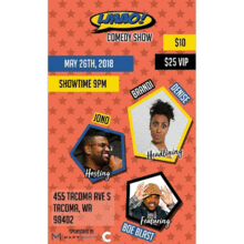 The LMAO Comedy show is back! Come kick off your Memorial day weekend with us as we bring in the funny at our new location. Our show will be hosted by Tacomas own Jono and will feature some of your local favorite comedians such as Boe Blast and more. We have a special treat in store for our audience as our show will be headlined by the ever so funny Brandi Denise who has been seen ripping the stages all over the country... So come out and enjoy a great night of comedy, share some laughs with loved ones, and enjoy great dining all in one setting.