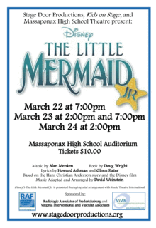 Stage Door Productions, Kids on Stage, and Massaponax High School Theatre present: Disney's The Little Mermaid, Jr. Music by Alan Menken Book by Doug Wright Lyrics by Howard Ashman and Glenn Slater Based on the Hans Christian Anderson story and the Disney film Music Adapted and Arranged by David Weinstein.
