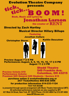 tick,tick.Boom! is Jonathan Larson's autobiographical tale of a young composer on the brink of turning 30 and falling into oblivion. Containing fourteen songs, ten characters, three actors, and a band, tick, tick.Boom! takes you on the playwright's /composer's journey that led to the Broadway blockbuster, RENT.