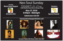 Memorial Day Weekend Featuring Local Artist House Food Vendor Black Seed Vegans Admission 10.00 Donation Bar Dj on the on the 1's & 2's Good and much more.... 21+ Open Mic