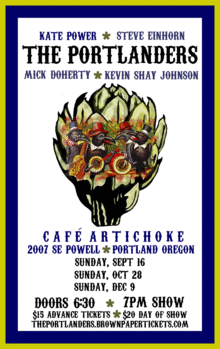 Urban-folk at Café Artichoke brings the inspired musicianship of The Portlanders - songwriters, Kate Power, Steve Einhorn, Mick Doherty and Kevin Shay Johnson - on guitars, banjo, hammered dulcimer, harmonica, upright bass, ukulele, accordion, bodhran, bones and four rich voices in a sumptuous quartet of multi-instrumentalists. Come out to Portland's most welcoming and intimate folk club for a harmonious evening of tunes, songs and stories among four soloists who have crossed strings in the local folk scene since the 1970's. Hosted in its new location, Artichoke Music welcomes THE PORTLANDERS for a monthly residency. Limited seats. Advance tickets suggested. Doors 6:30PM, Showtime 7PM. Beer and wine available. All ages welcome. $15 advance (fees may apply), $20 Day of Show.