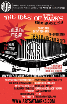 On Friday, March 15, 2013, HAPA (Hawaii Academy of Performing Arts), The Chinatown Artist Lofts & The ARTS at Marks Garage present The IDES of Marks: A Celebration of The ARTS from 730-9pm at The ARTS at Marks Garage.