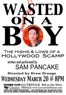 "When I was a little boy in West Virginia, spinster great-aunts, elderly church ladies and such would clock my big blue eyes, wavy locks and curly lashes and exclaim, 'Wasted on a boy!' I, knowing and relishing my true nature, would smirk and think to myself, 'Not wasted on THIS boy!'" Join actor and comedian Sam Pancake as re-traces his journey through show-biz, from being "forced" as a child to do drag in a Minstrel Show in Appalachia to being labeled "Hollywood's Go-To-Gay Guy" by Advocate Magazine in 2010. Stories will be told, mud will be flung, names will be named. Drink up and enjoy!