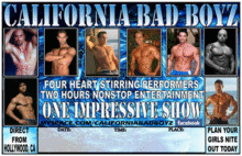 The tux goes on.. The final adjustment of a tie... then..music..... lights.... ACTION! The show explodes on stage with a dazzling variety of choreographed acts. Ladies know what they like... The ladies we know... Like to watch Men! So, imagine a Las Vegas style production featuring the best looking Male Bodies ever to flex on stage! CALIFORNIA BAD BOYZ proudly presents, in the grand tradition of Hollywood, a male extravaganza guaranteed to please the most discriminating man watcher.