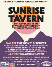 Sunrise Tavern is an intimate gathering on a mountain top overlooking Reno, NV. Featuring 20 hours of live bands and DJ's on 2 stages, food trucks, beer garden, art cars, aerialists, lights, fire art, & live painting. The main stage is at 8000'- so dress warm for the late night.