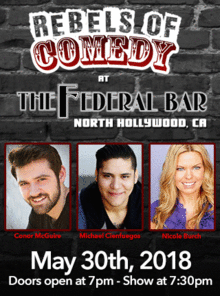 It's Rebels of Comedy at the Federal Bar in North Hollywood. Come out and see a night of live comedy, featuring an awesome lineup of professional features and headliner comedians.