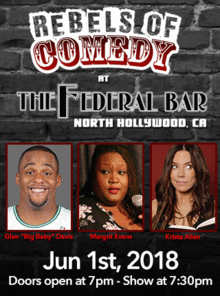 It's Rebels of Comedy at the Federal Bar in North Hollywood. Come out and see a night of live comedy, featuring an awesome lineup of professional features and headliner comedians.