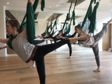 The use of aerial yoga and dance in a life performance, choreographed by Joanna Puchala: https://youtu.be/PYqNKLhotxE