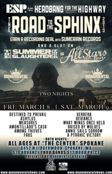 Your band will be playing in front of an A&R rep (s) from Sumerian Records and Headbang for the Highway. Your band is competing for a regional time slot on Summer Slaughter or All-Stars for round 1. In addition, if your band should be chosen as the winner of your Headbang date, you will advance to the 2nd round of 3 to play a regional semi-final for a Sumerian Records recording deal. In the second round you would compete with 6-9 other bands with the same style of judging as round 1. Bands winning the second round will be required to travel to Hollywood, CA to play with 9 other bands where at least one band will be chosen as the winner and signed to a Sumerian Records recording deal. Bands will be responsible for their own travel and expenses on all the shows.