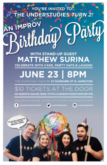 The Understudies Turn 2: An Improv Birthday Party! Saturday June 23, 2018 at 8:00 p.m. Tickets: $10 The Staircase Theatre, 27 Dundurn St N. Hamilton
