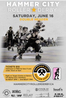 5 PM: Hammer City Eh! Team vs CNY Roller Derby from Utica, New York 7 PM: Hammer City Pier Pressure vs Queen City Roller Girls Queens Court from Buffalo, New York