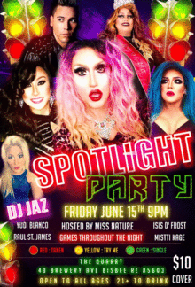 Friday June 15th (Hosted by: Miss Nature) will be our Spotlight Party. Let all those in attendance know who you are. Wear Red to indicate that you are taken, Yellow if you are talking to someoe and Green if Single. There will be games throughout the night based on the theme so be sure to dress the part. Wear your colors and show us your pride!!!!!!! In this show is the fabulous Isis D'Frost, Mistti Kage, Yudi Blanco, Miss Nature and our first male performer Cruz Carter.