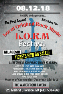 GetREAL Media presents... The First Annual L.O.R.M. Festival!!! (Local Original Rock Music) At the Waterfront Tavern 920 Main St, Holyoke, MA $20 All Day Pass/All Ages General Admission Support local original music Gates open at Noon Bands start at 12:30 Seven local original bands from the New England area: +UNTITLED +THE SAGE KING BAND +CHRISTINA & THE FLYING CANTALINIS +ARC CITY ANGELS +WEST SUMMIT +LIVIO GRAVINI & THE FREE SPIRIT SOCIETY +THE WAVVE TRIO Support you local original music scene!!!!
