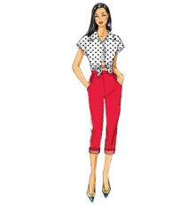 Stitch a button-down shirt with a wing collar, short kimono sleeves and a tie waist. Make capri-length high-waisted pants with tapered legs and a back zipper that can be made out of either denim or a twill or a stretch woven.