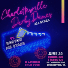 Come see the Charlottesville Derby Dames All-Stars go head to head against the Boston Roller Derby All-Stars!