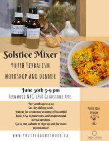 This is one of the Youth Food Network's seasonal get-togethers! Doors open at 4 pm at the Fernwood NRG. We will be in the gymnasium, and if it's nice, spilling outside as well!