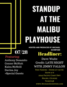 Brand new to the stage at The Malibu Playhouse is headliner Dave Waite who has appeared on Late Night with Jimmy Fallon, Comedy Central, and Last Comic Standing!