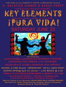 Community Center of Mendocino and Pura Vida present a Latin dance party on Saturday, June 23, featuring Bay Area Latin/Brazilian jazz ensemble Key Elements, Pura Vida, and TreMendo Samba. This event is a fundraiser for the Community Center and the After School Enrichment Program.