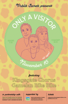 To celebrate their residency at the Hadden Park Fieldhouse, art collective Publik Secrets presents a concert of new music featuring the art pop quintet Only A Visitor in collaboration with the Kingsgate Chorus. Joining the evening is Gamelan Bike Bike, a Balinese gamelan inspired ensemble that uses recycled bicycles as their instruments.
