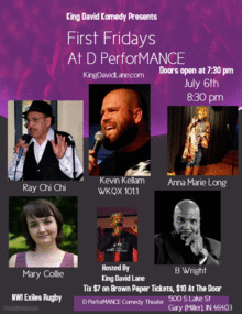 The First Friday of the month we put together a great line up of stand up comedy and/or improv. This month's show features King-David Lane as your host with a stacked line up of Chicago/NWI talent including the very funny Kevin H. Kellam, Jenni Berzac, Darryl Perfor Mance, Ray Arebalo, Ashley Woods, BWright Comedian, & special guests Josh R. Sumrall & Big Ray Morales! $7 in advance or $10 at the door. Doors open at 7:30! Show starts at 8:30. Music playing before & after the show.
