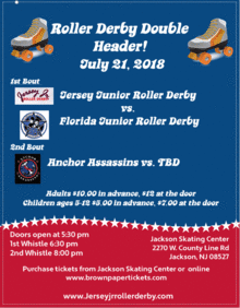 1 st Bout is Jersey Junior Roller Derby vs Florida Junior Roller Derby , followed by a second bout featuring an adult team The Anchor Assassins . Doors Open at 5:30 pm 1st whistle is 6:30 2nd whistle is 8:00 pm
