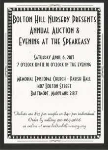 Please join us for Bolton Hill Nursery's 13th Annual Auction and Evening at the Speakeasy- Saturday, April 6th, 2013 from 7-10pm at Memorial Episcopal Church.